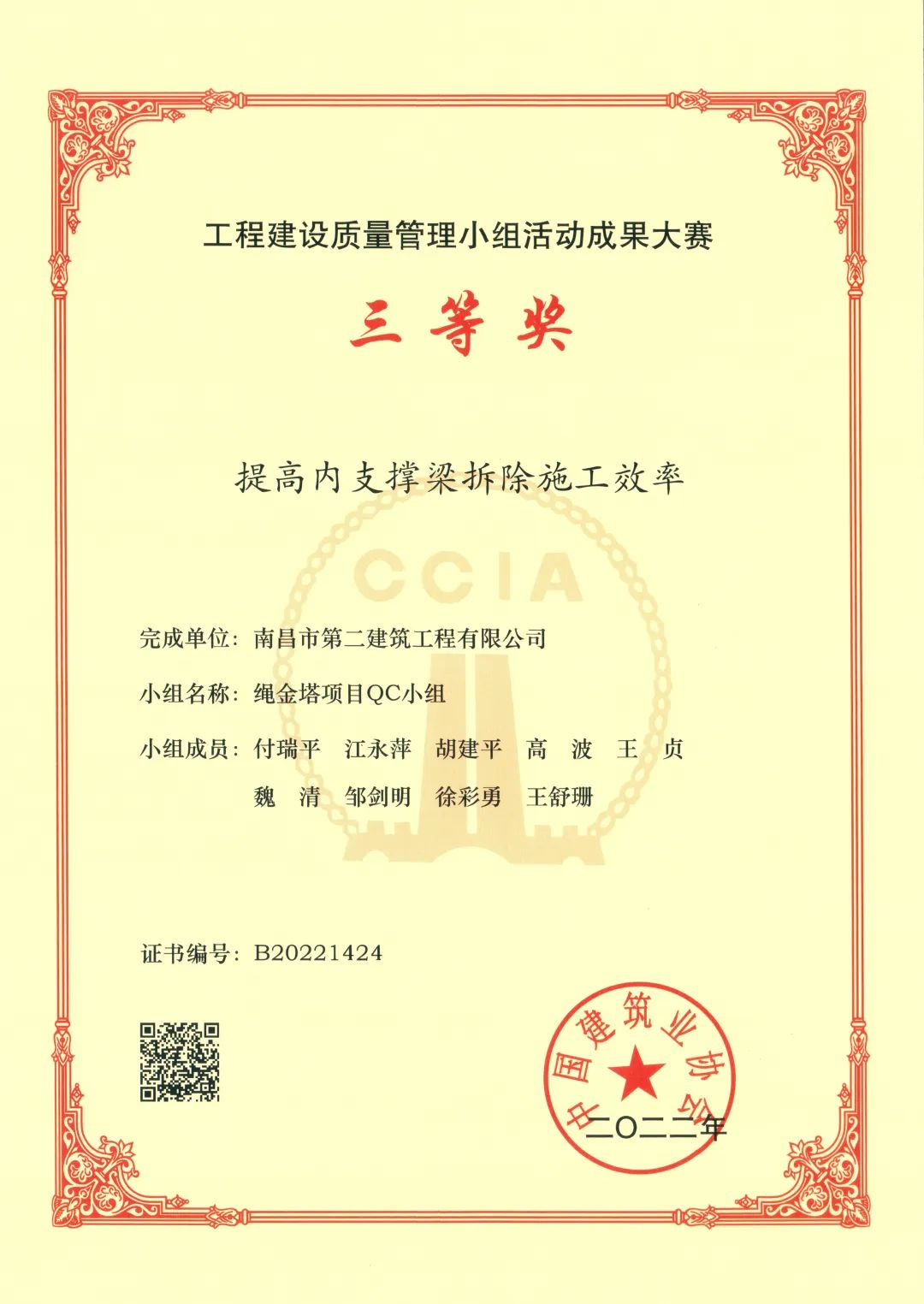 近日,公司繩金塔項目QC小組在2022年全國工程建設質(zhì)量管理小組活動成果大賽評選中榮獲三等獎。